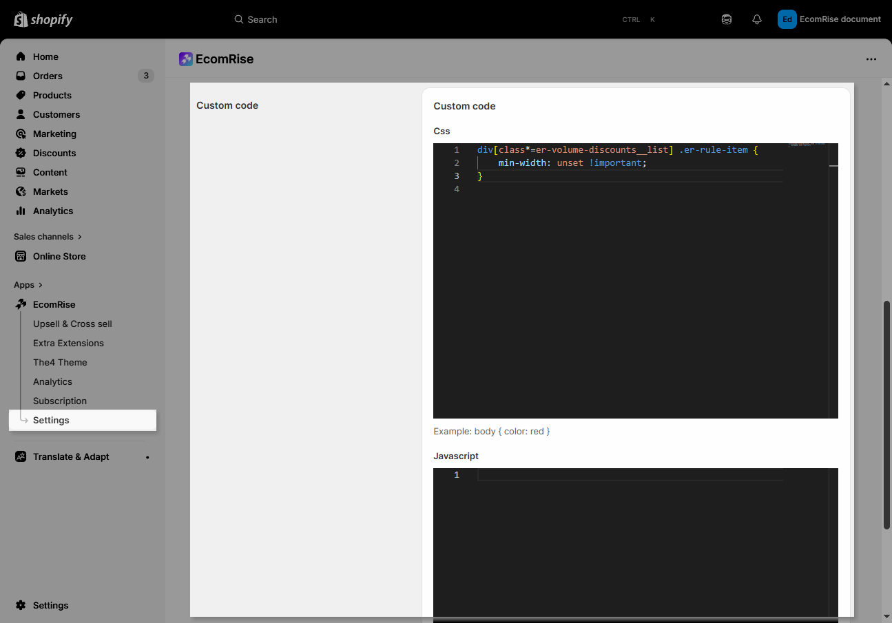Use this section to add your own CSS or JavaScript to customize the app’s features.